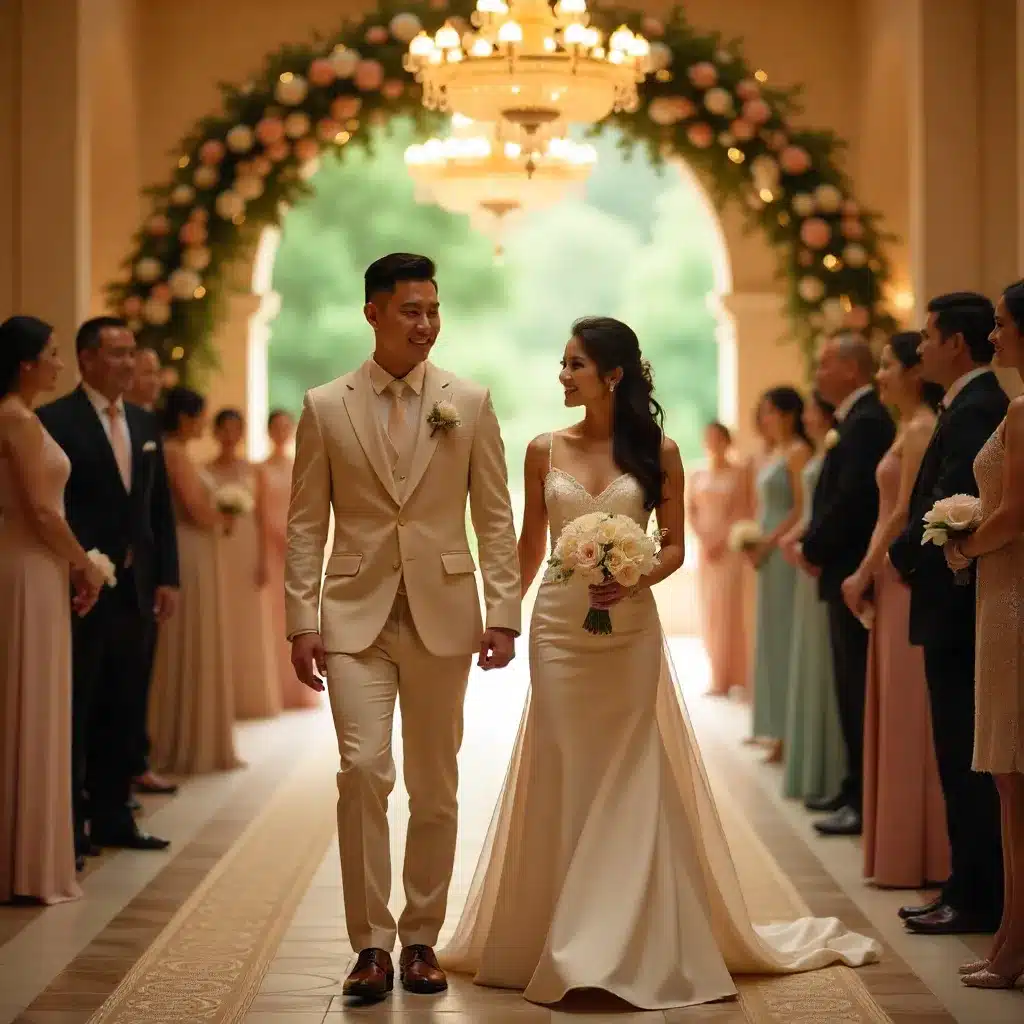- Lý do phù hợp: Neutrals an toàn, dễ phối, phù hợp mọi theme cưới.