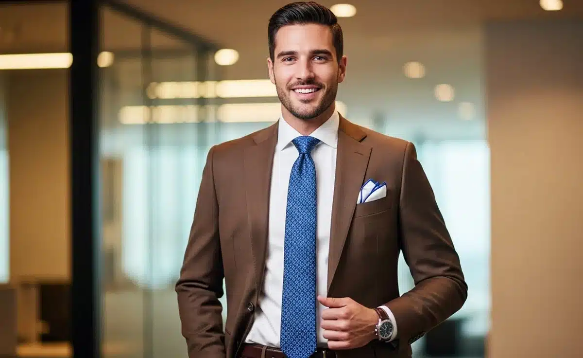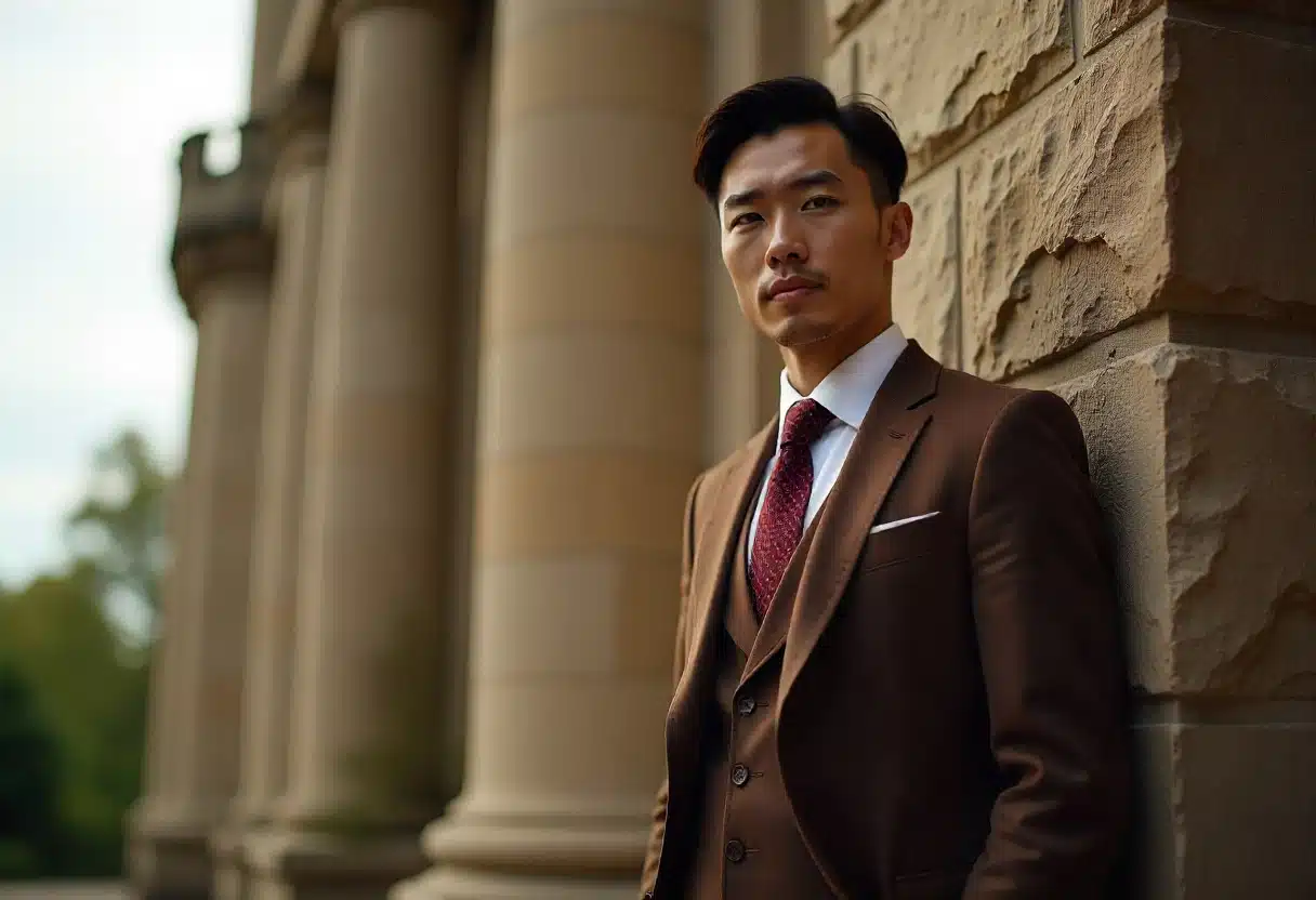 • Cà vạt nâu phối xanh olive hoặc burgundy. Mẹo: Phá bỏ quy tắc “no brown in town” – nâu giờ hợp mọi nơi trừ white tie.