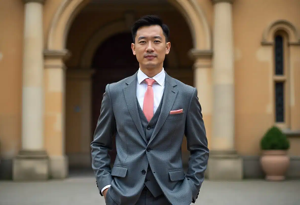 • Cà vạt đỏ crimson với áo sơ mi trắng, vest xám – thu hút ánh nhìn mà không lố.