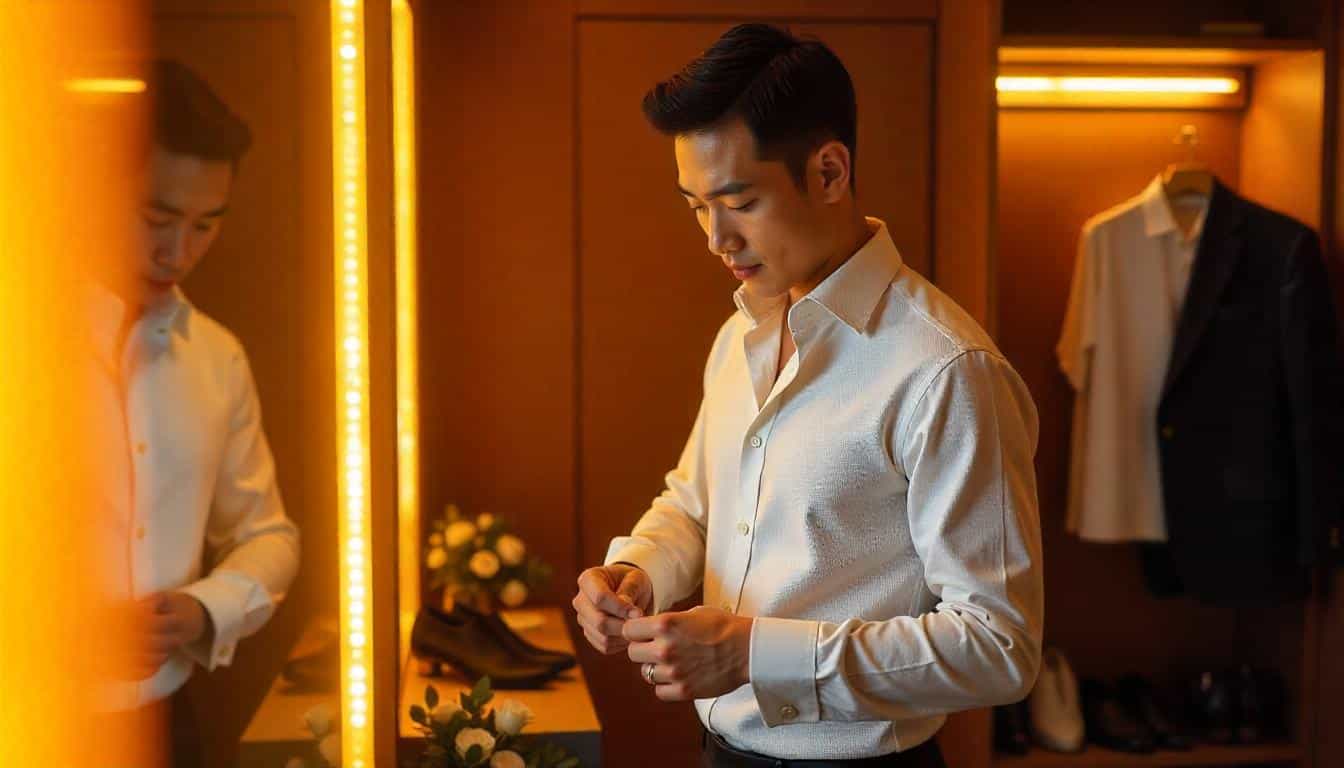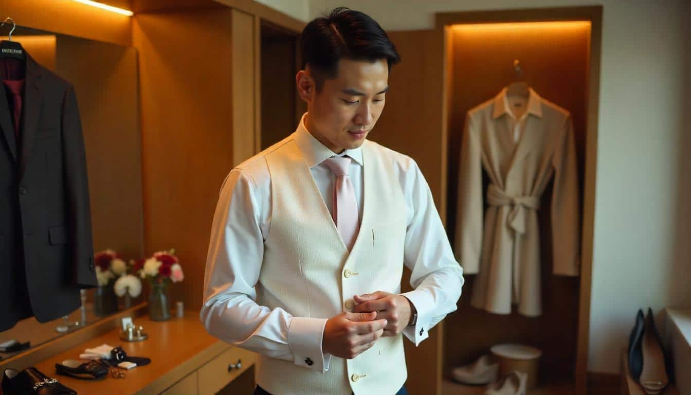 Chúng tôi nghĩ đây là một sự kiện đầy niềm vui của cả hai bên gia đình, bạn hãy thử tận hưởng nhiều nhất có thể và thay đổi trang phục theo phong cách của bạn! Nếu đám cưới formal, bạn chỉ cần tuân theo nghi thức với một bộ tuxedo hay trang phục đám cưới ban ngày, tuỳ theo thời gian diễn ra sự kiện.